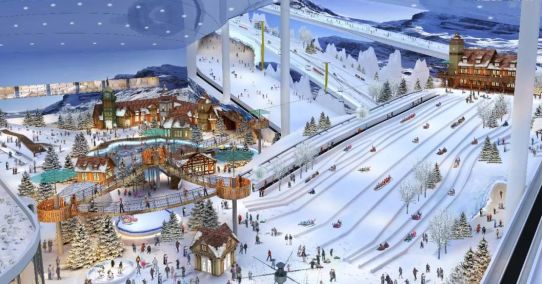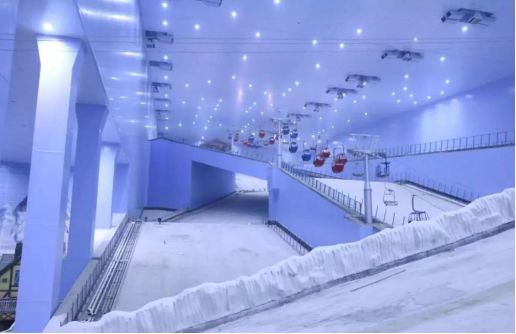 滑雪场采用“巨型砼柱+大跨度空间桁架”结构,作为屋盖钢结构的唯一支撑,这是该滑雪场建设的最大难点。该滑雪场设有4条雪道:雪橇滑道、中级滑道、初级滑道和初学者滑道。滑道最大落差66米,最大坡度21°。初级滑道最长460米。整个滑雪场要打造成一座“冰雪城堡”,分一大一小两座雪山,内部细分为探险步道等多个功能区,滑雪道顶端将开一家“山顶咖啡厅”。儿童雪山高10米左右,坡度平缓。探险步道下方还设置一处“冰湖”,满足游客不同游乐需求。